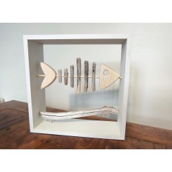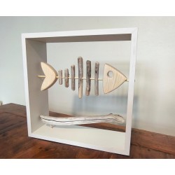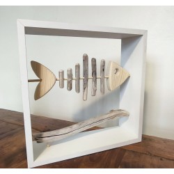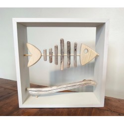Poisson en bois sculptée et bois flotté dans son cadre 40x40